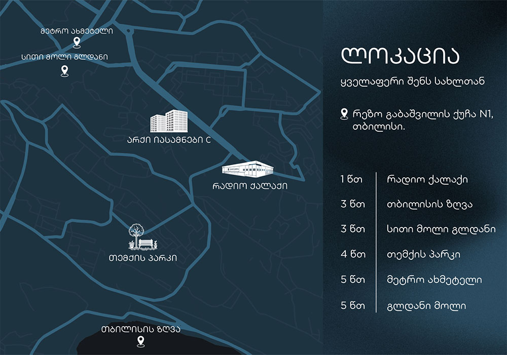 • მეტრო „ახმეტელთან“, რომელიც ქალაქის ცენტრთან გაკავშირებთ – 5 წუთში