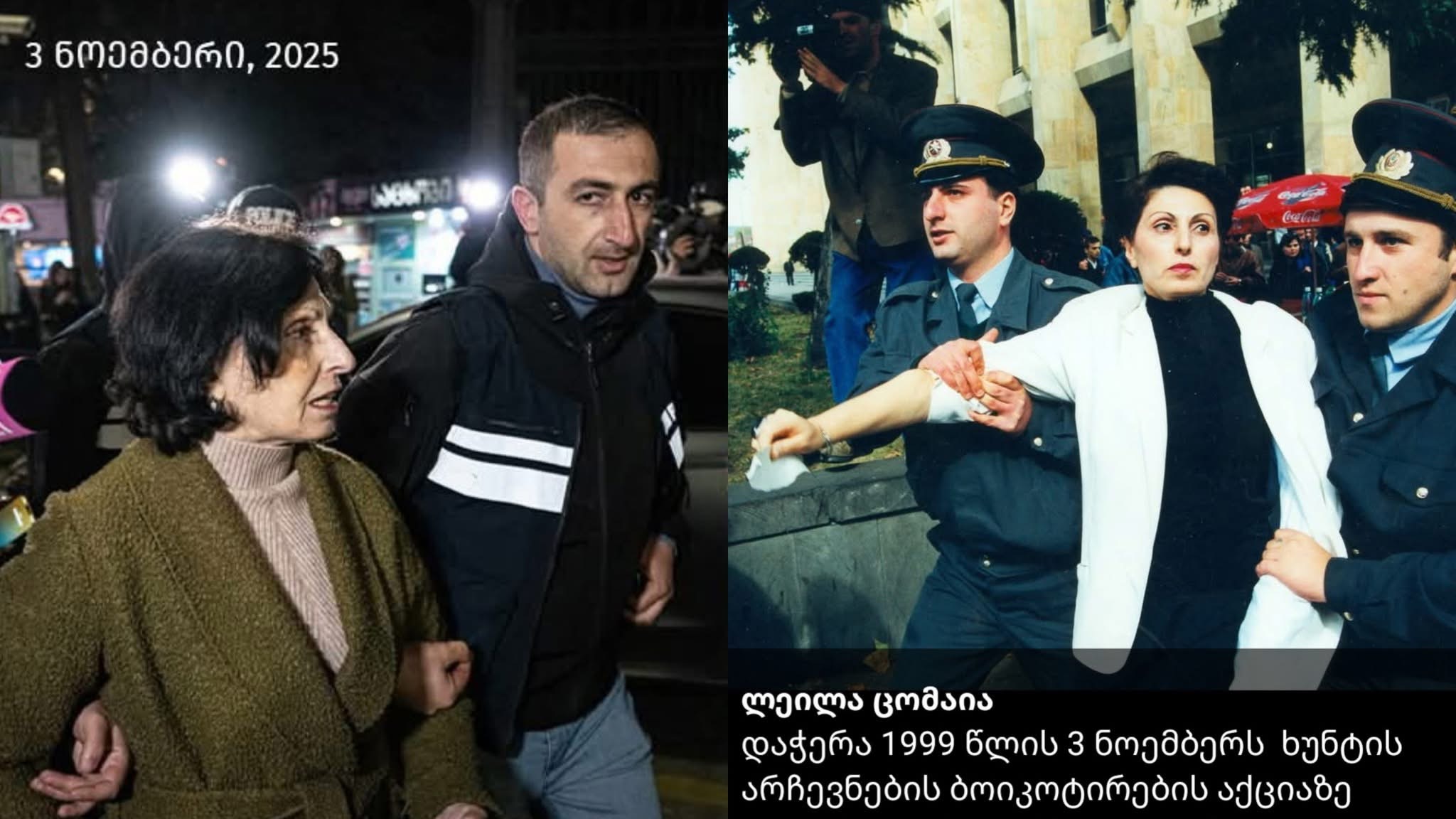 <blockquote>სამოქალაქო აქტივისტი სალომე სიმონია ფოტოებს აქვეყნებს და წერს:</blockquote> ,,26 წელია ამ ორ ფოტოს შორის სხვაობა. ლეილა ცომაია 3 ნოემბერს დააკავეს შევარდნაძის დროსაც და ახლაც. თურმე ზვიად გამსახურდიას და მერაბ კოსტავას თანამებრძოლი ყოფილა. 26 წლის მერეც ლამაზი და შეუპოვარია.“