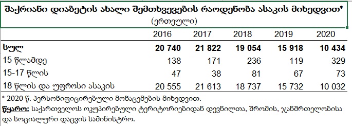 თუ 2016 წელს 15 წლამდე ასაკის ბავშვებში შაქრიანი დიაბეტის 138 ახალი შემთხვევა გამოვლინდა, 2020 წელს ეს მაჩვენებელი 329 იყო. გაზრდილია მაჩვენებელი 15-17 წლის ასაკობრივ კატეგორიაშიც. 18 წლისა და უფროსი ასაკის ადამიანების შემთხვევაში კი, მაჩვენებელი თითქმის ორჯერ შემცირდა.