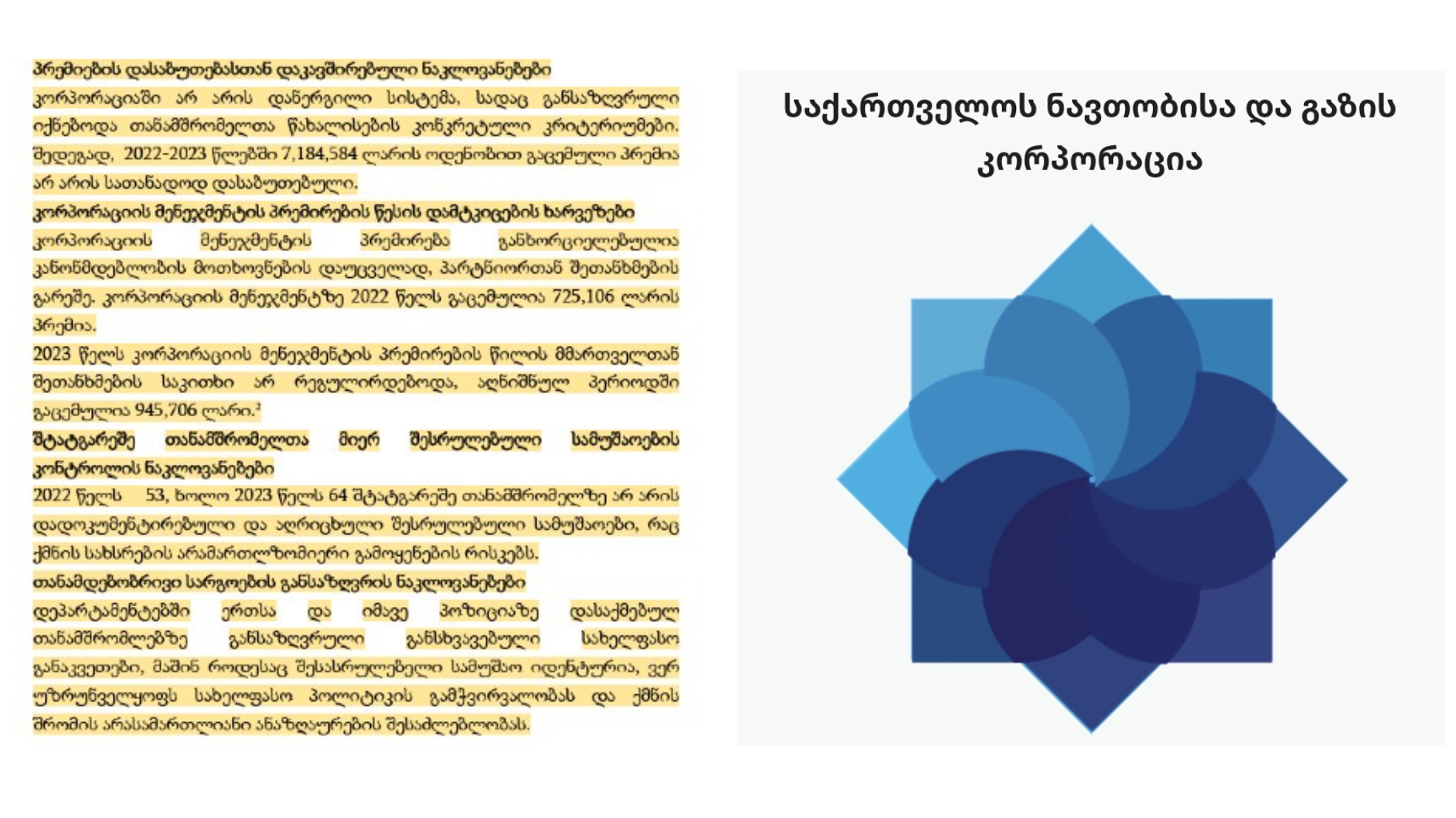 ასევე, გამოვლინდა კორპორაციის მენეჯმენტის პრემირების წესის დამტკიცების ხარვეზები: