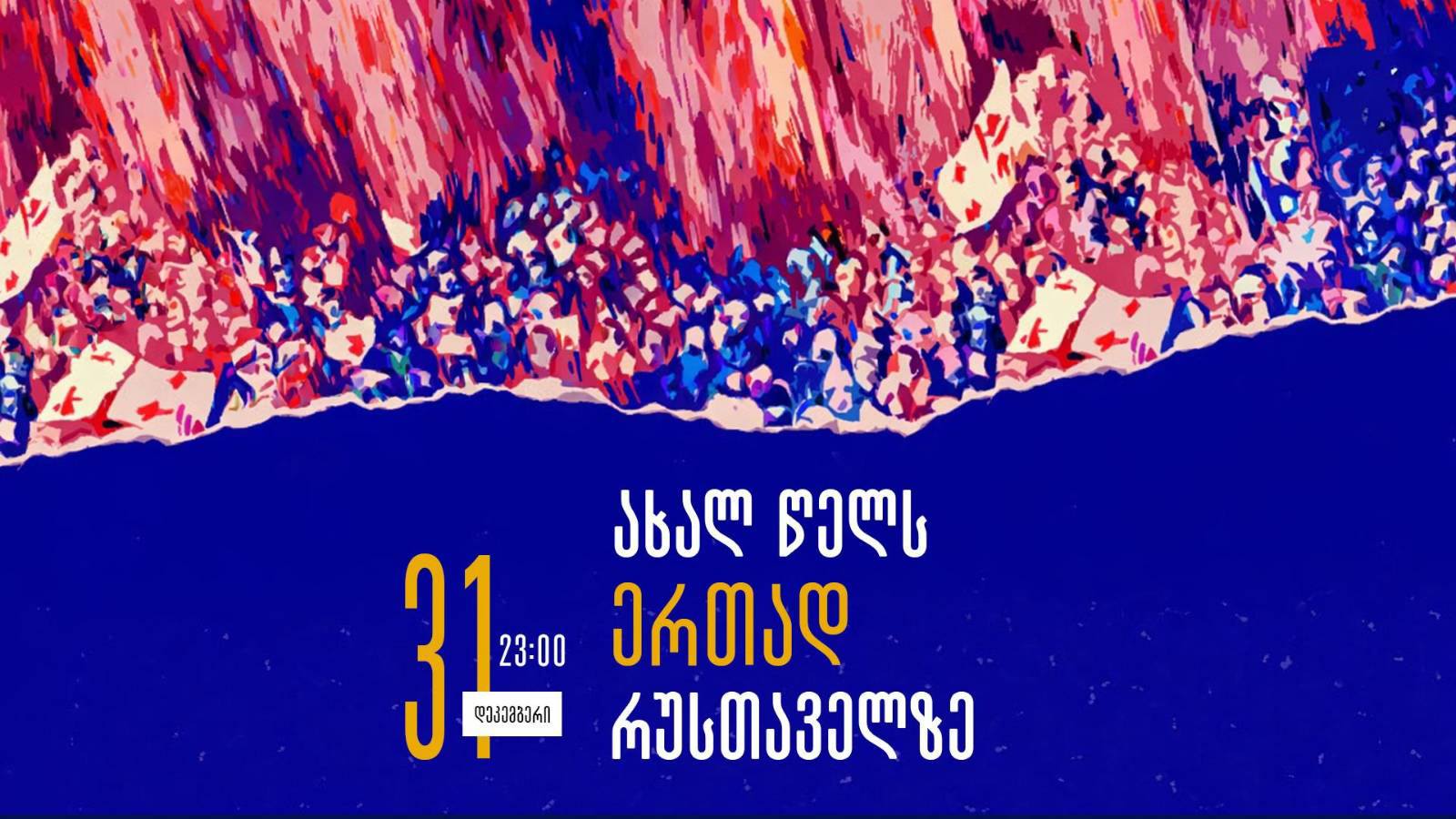 საახალწლო პროგრამა დაიწყება 23:00 საათიდან პირველ სკოლასთან, სადაც მოვისმენთ სინდისის პატიმრების გზავნილებს, წინააღმდეგობაში მყოფი ხელოვანების კონცერტს და პროექტებს.პარლამენტის მიმდებარედ კი, შევძლებთ, გავუგზავნოთ გზავნილი მომავალ თაობებს რუსთაველიდან; ნაჭერზე აღბეჭდილი გზავნილები თბილისის მომავალი მუზეუმის ექსპონატად იქცევა.ახალი წელი ყველასია, ამიტომ ვისაც მოესურვება, შეუძლია მოიტანოს ტკბილი თუ ცხელი, ამბავი თუ პროექტი რუსთაველზე.შევხვდეთ ერთად ახალ წელს რუსთაველზე!