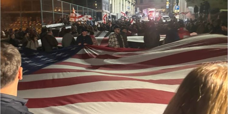 აქციის მონაწილეებს თან აქვთ ამერიკის დროშები.