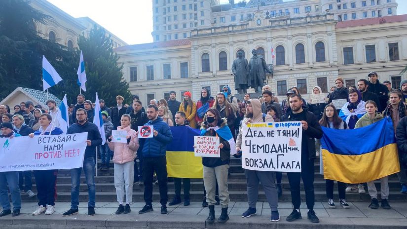 რუსთაველის გამზირზე, პირველი კლასიკური გიმნაზიის წინ, უკრაინისა და რუსეთის მოქალაქეები არიან შეკრებილი – ისინი პუტინის რეჟიმს აპროტესტებენ და უცხადებენ სოლიდარობას უკრაინელებს.