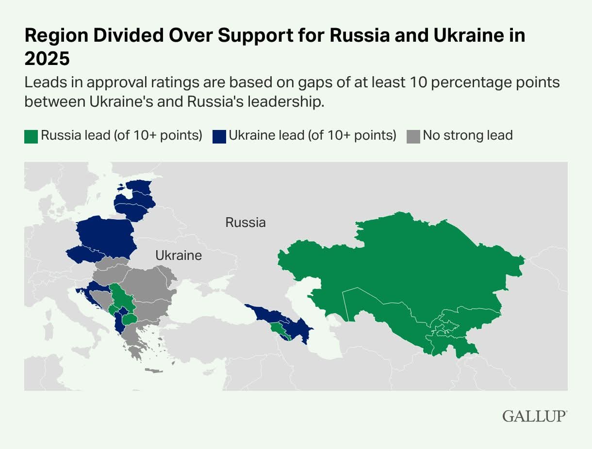 Gallup-ის უახლესი კვლევა და თანდართული რუკა აღმოსავლეთ ევროპისა და ცენტრალური აზიის გეოპოლიტიკურ რღვევას მკაფიოდ აჩვენებს: ლურჯი ფერით აღნიშნულია ის ქვეყნები, სადაც უკრაინის ლიდერის მხარდაჭერა 10 ან მეტი პროცენტით აღემატება რუსეთისას. მწვანე ფერი აღნიშნავს ტერიტორიებს, სადაც რუსეთი ლიდერობს. ხოლო ნაცრისფერი ეს არის გადაუწყვეტელი, ანუ “No Strong Lead” ზონა, სადაც მკვეთრი უპირატესობა არცერთ მხარეს არ აქვს და საზოგადოება ორადაა გაყოფილი.