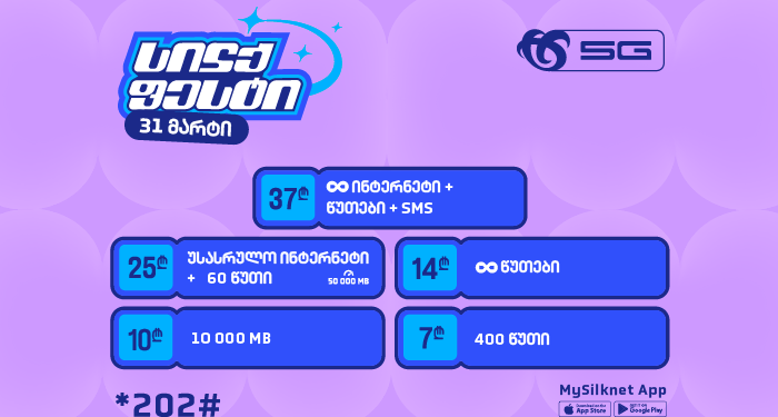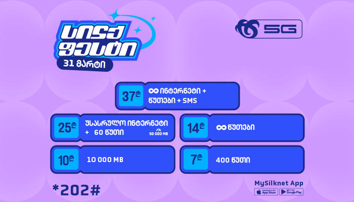 31 მარტს, აპლიკაციით MySilknet , კოდით *202# ან პირდაპირ ვებ გვერდიდან, სილქნეტის მომხმარებელი სპეციალურ ფასად შეიძენს ერთ და მეტ პაკეტს სილქფესტის შეთავაზებიდან: