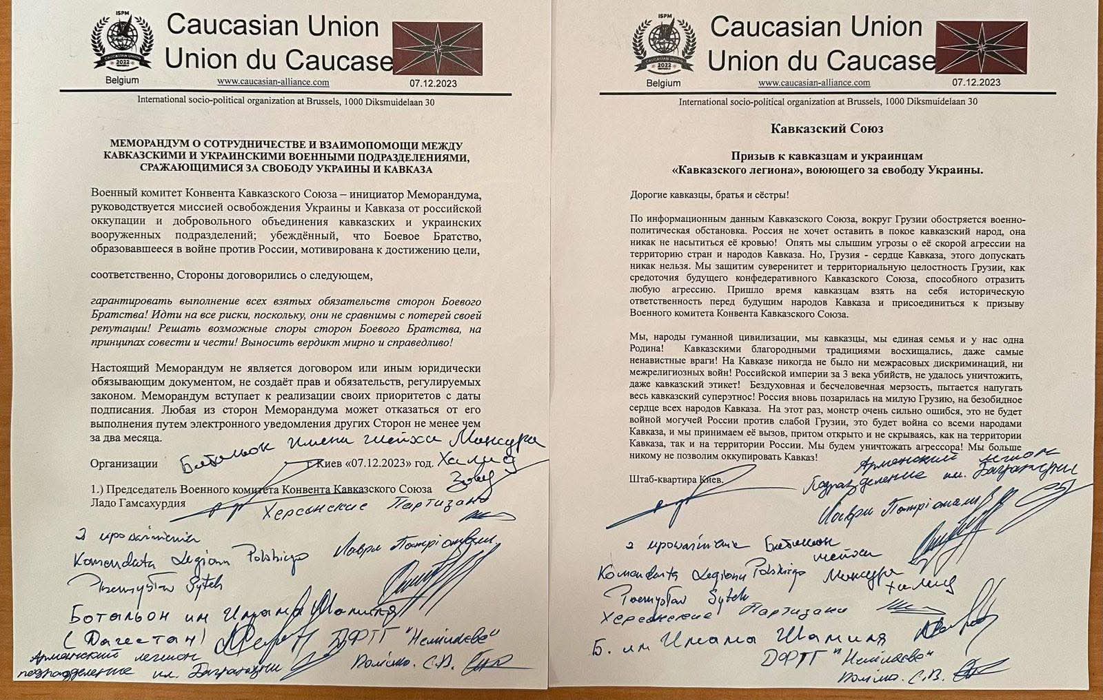 🔘 “კავკასიის კავშირის” მემორანდუმი (ფოტოზე მარცხნივ)-მიღებულია კიევში 2023 წლის 7 დეკემბერს, ხელმოწერილია კავკასიის კავშირის კონვენტის სამხედრო კომიტეტის თავმჯდომარის ლადო გამსახურდიასა და “კავკასიის ლეგიონში” შემავალი ყველა სამხედრო ჯგუფის, მათ შორის სომხური, აზერბაიჯანული, ჩეჩნური და სხვა ბატალიონების მიერ.