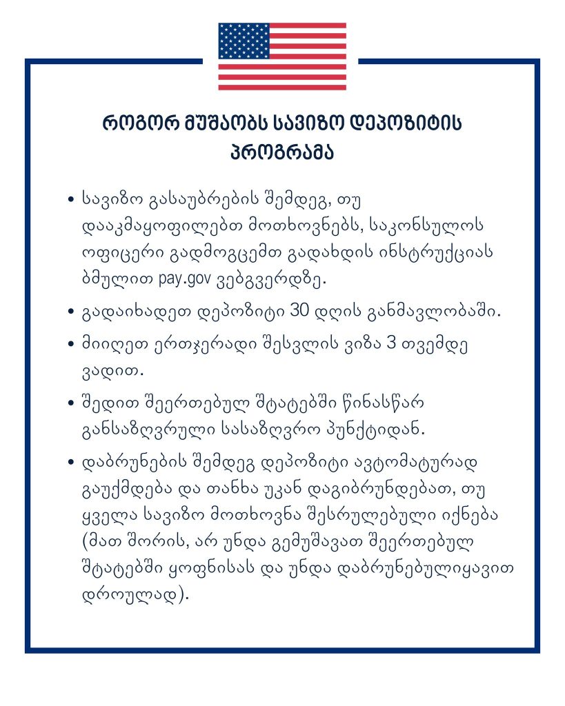 დამატებითი ინფორმაციისთვის, გაეცანით ხშირად დასმული შეკითხვების გვერდს: https://ge.usembassy.gov/ka/visas-ka/#Deposit