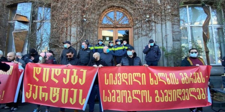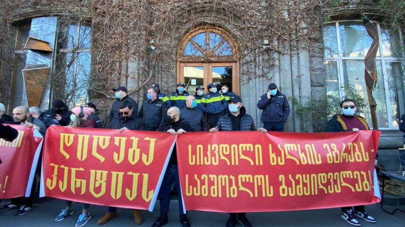 „დიდება პარტიას”, “სიკვდილი ხალხის მტრებს”, “ბოლშევიკური ენერგიით ბოლო მოვუღოთ მავნებლობის შედეგებს“ – სიმბოლურად საბჭოთა გამონათქვამებით წარწერებიანი პლაკატები აქვთ გაშლილი კულტურის სამინისტროსთან მიმდინარე საპროტესტო აქციაზე, სადაც თეა წულუკიანის რეპრესიულ პოლიტიკას აპროტესტებენ.