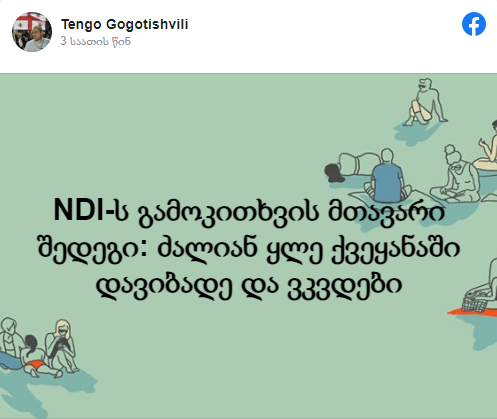 ჟურნალისტი, თენგო გოგოტიშვიილი სოციალურ ქსელში NDI-ის კვლევის შედეგებს ეხმაურება. "NDI-ს გამოკითხვის მთავარი შედეგი: ძალიან ყ*ე ქვეყანაში დავიბადე და ვკვდები", - წერს ჟურნალისტი.