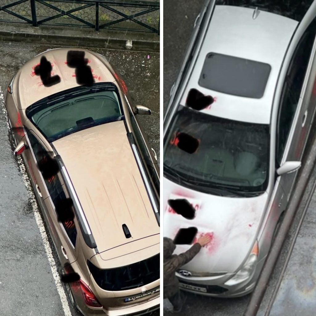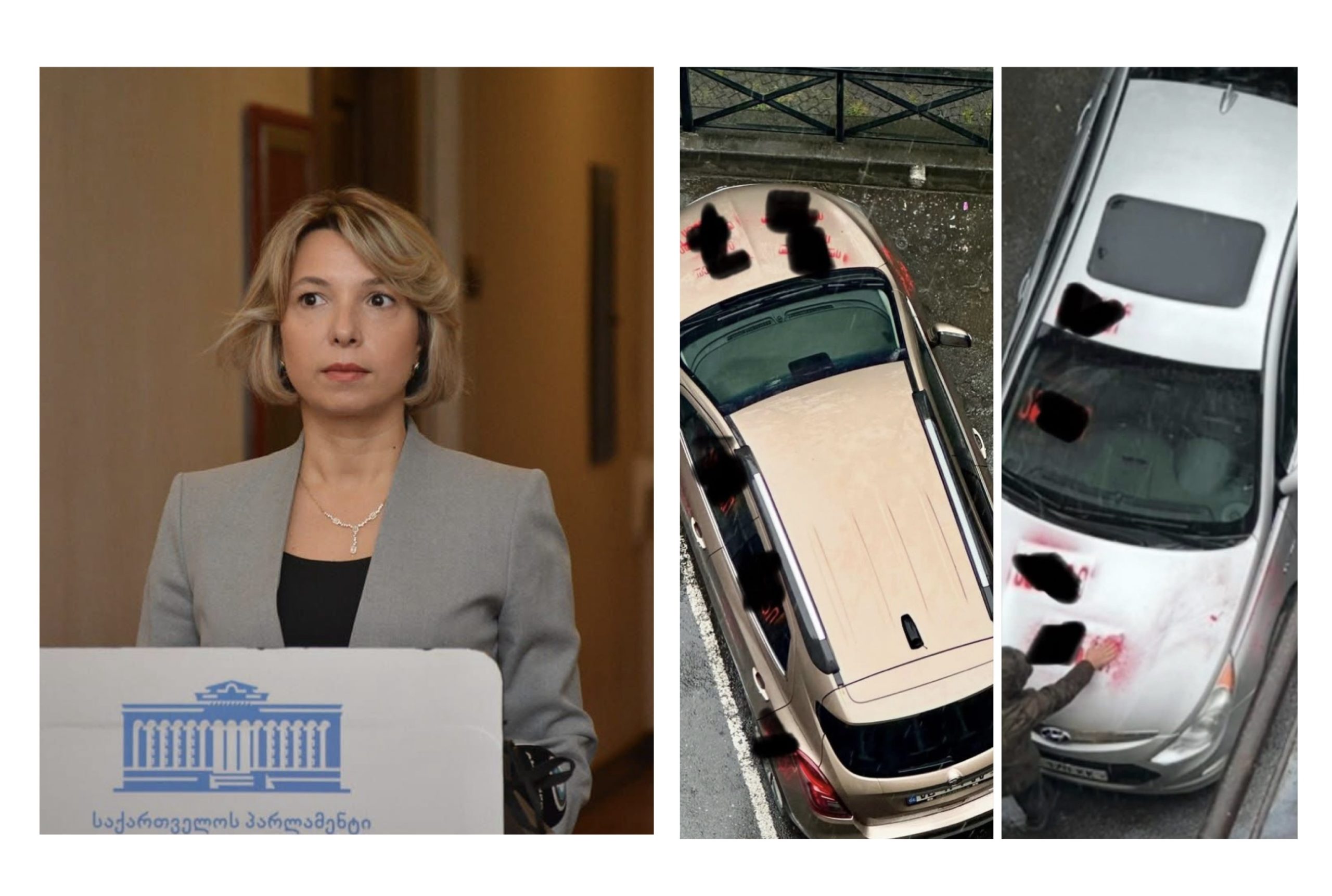 ,,ეს ჩემი და ჩემი ოჯახის წევრის მანქანებია, “რუსული კანონის” აქციების პერიოდში დააზიანეს – ჩაკეტილ სივრცეში შემოვიდნენ გვიან ღამით და წარწერები დატოვეს.
