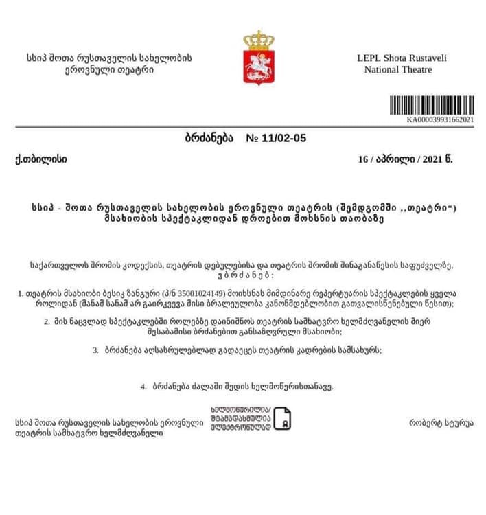 ბრძანება 16 აპრილითაა დათარიღებული! დაიწერა, თუ არა, ის მინისტრ წულუკიანის კომენტარის შემდეგ, რა დროსაც, თეა წულუკიანმა მოითხოვა ბესო ზანგურს თეატრი დაეტოვებია – უცნობია.
