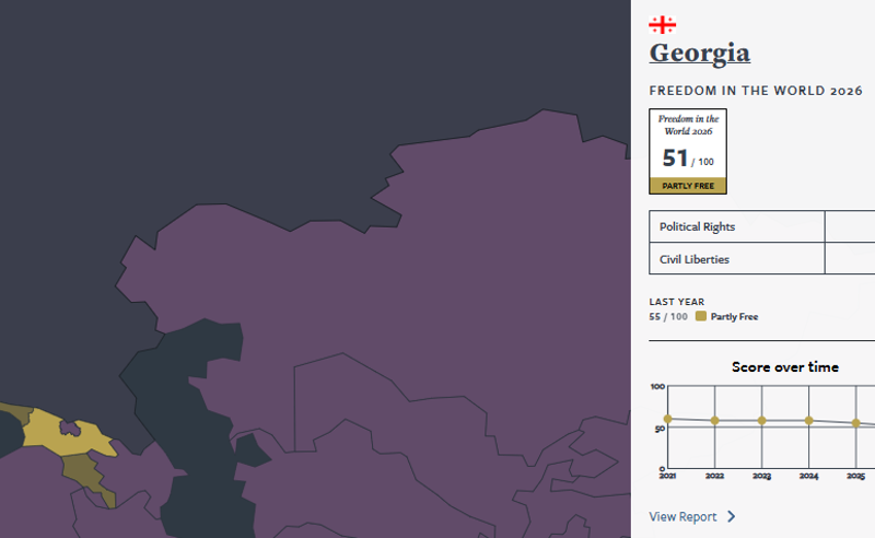 Freedom House-ის 2025 წლის ანგარიშის მიხედვით, რომელიც, დღეს, 19 მარტს გამოქვეყნდა, ერთ წელიწადში საქართველოს რეიტინგი 4 ქულით შემცირდა, რაც ევრაზიის რეგიონში ყველაზე დიდი ვარდნაა.