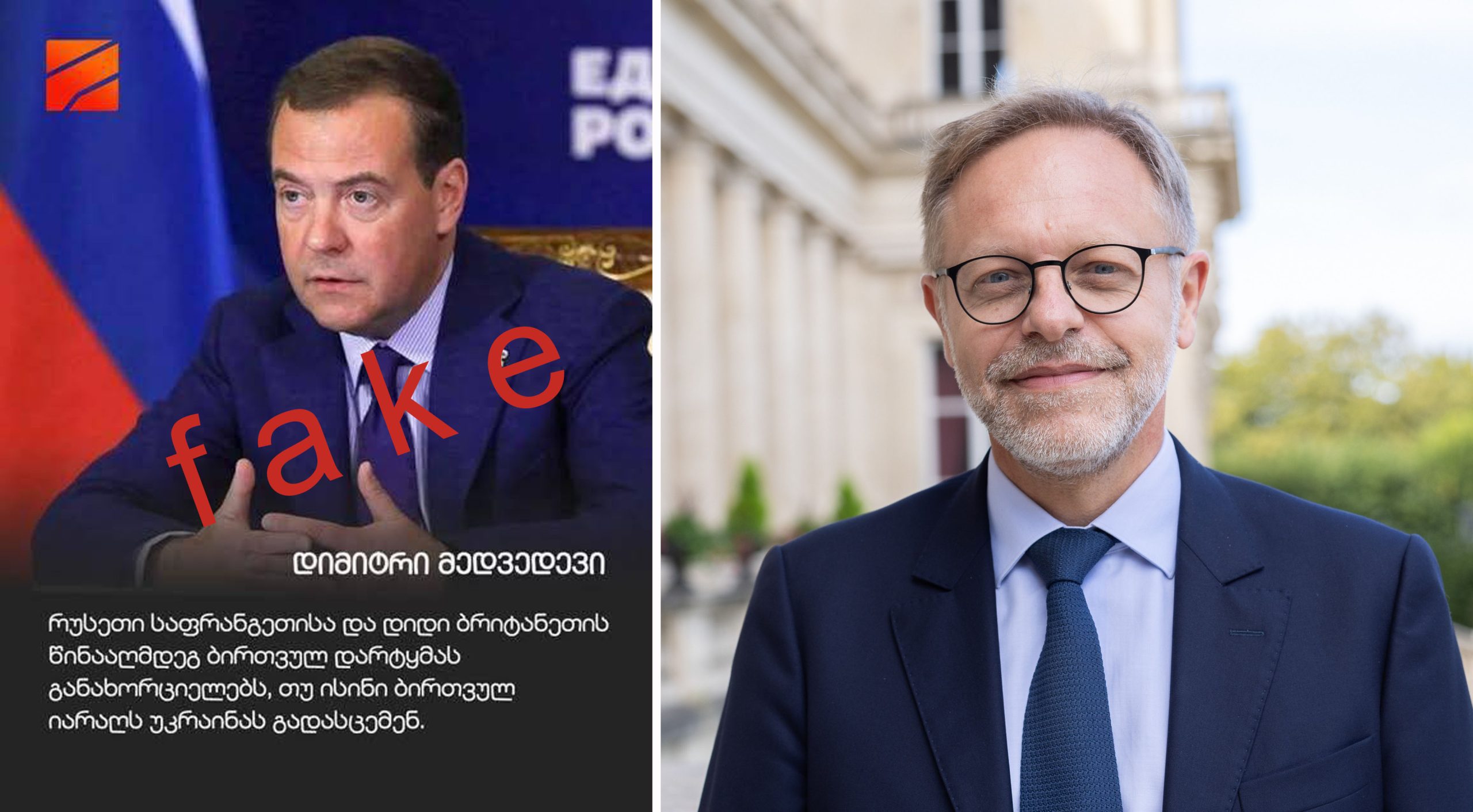 საქართველოში საფრანგეთის ელჩი, სოციალურ ქსელში, აზიარებს “რუსთავი 2-ის” ნიუსს, რომლითაც მედია რუსეთის უშიშროების საბჭოს მდივნის მოადგილეს, დიმიტრი მედვედევს ციტირებს, თითქოს საფრანგეთი და ბრიტანეთი უკრაინისთვის ბირთვული იარაღის გადასაცემად ემზადებიან.