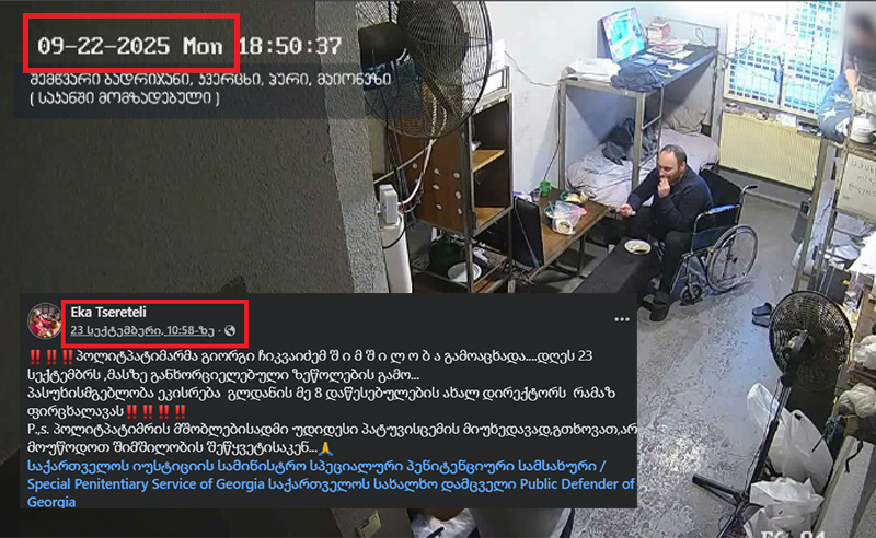 გიორგი ჩიკვაიძის დედა, ეკა წერეთელი სპეციალური პენიტენციური სამსახურის მიერ გავრცელებულ კადრებს ეხმიანება და წერს, რომ ბიზნესმენმა შიმშილობა 23 სექტემბერს დაიწყო, უწყებამ კი 20-22 სექტემბრის კადრები გამოაქვეყნა.