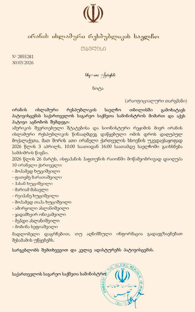 საქართველოში ირანის ისლამური რესპუბლიკის ელჩი, განცხადებას აქვეყნებს, რომლიდანაც ცნობილი ხდება, რომ ხვალ, პარასკევს, იწვევს საელჩოში საქართველოს მოქალაქეებს.