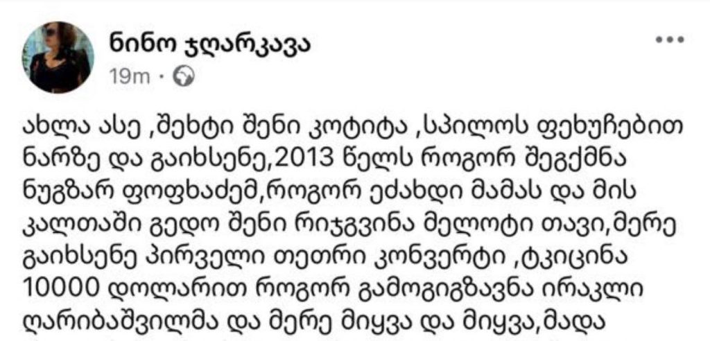 ან დაამტკიცებს, რომ ირაკლი იხდიდა ფულს, საკუთარი ოჯახის წინააღდეგ სიბინძურეების მოგონებაში … ან დამტკიცდება, რომ ქვეყანას „ელისო კილაძე-2“ მოევლინა ნინო ჯღარკავას სახით…!,