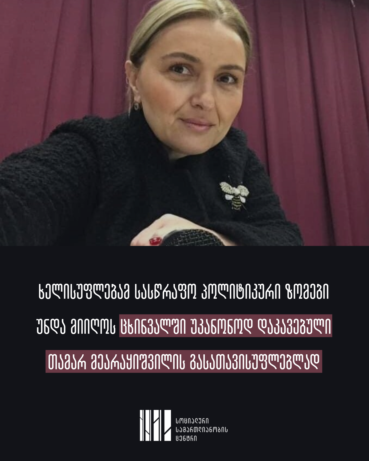 ხელისუფლებამ სასწრაფო პოლიტიკური ზომები უნდა მიიღოს ცხინვალში უკანონოდ დაკავებული თამარ მეარაყიშვილის გასათავისუფლებლად- სოციალური სამართლიანობის ცენტრი