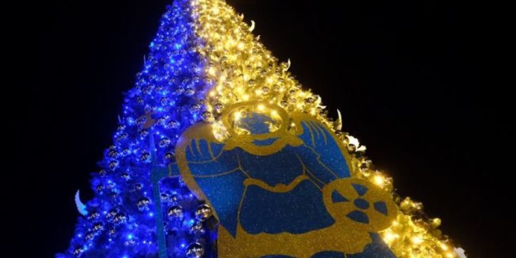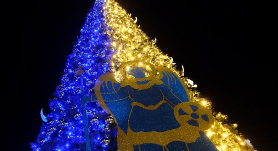 12 მეტრის სიმაღლის ნაძვის ხე უკრაინის დროშის ფერებშია განათებული.