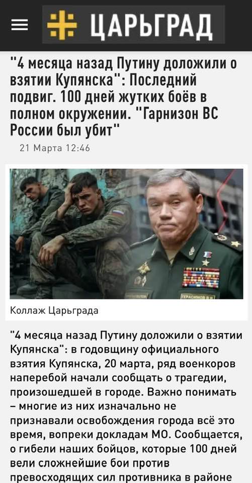 რუსი “ვოენკორები” ადასტურებენ რომ, ხარკოვის ქალაქ კ უ პ ი ა ნ ს კ შ ი, რომლის აღების შესახებ ცრუ მოხსენება გაუკეთა 100 დღის წინ გენშტაბის უფროსმა გერასიმოვმა პუტინს, დატრიალდა ტრაგედია…