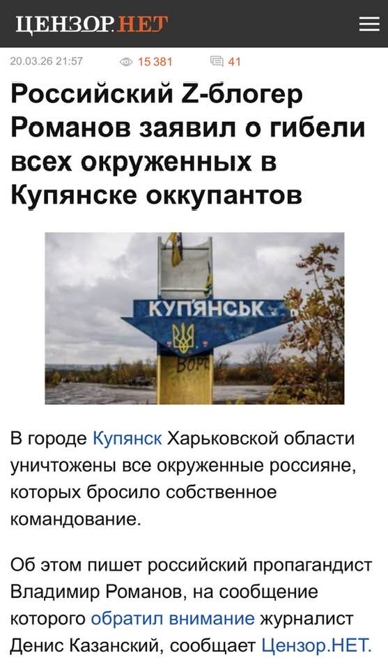 რუსი სამხედრო კორესპოდენტები წერენ უპრეცედენტო ომის დანაშაულზე სამხედრო მეთაურების მხრიდან: გენშტაბმა თავიდანვე იცოდა რომ კ უ პ ი ა ნ ს კ ს უკრაინელები აკონტროლებდნენ!