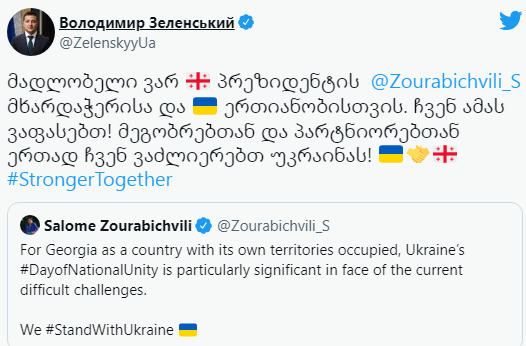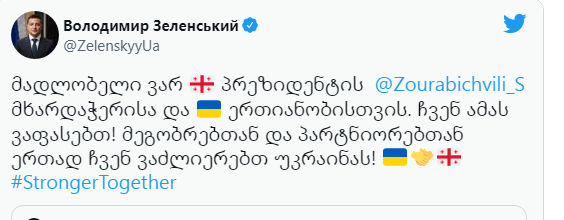 „მადლობელი ვარ საქართველოს პრეზიდენტის, სალომე ზურაბიშვილის მხარდაჭერისა და უკრაინის ერთიანობისთვის. ჩვენ ამას ვაფასებთ! მეგობრებთან და პარტნიორებთან ერთად ჩვენ ვაძლიერებთ უკრაინას!“ – დაწერა ვოლოდიმირ ზელენსკიმ Twitter-ზე.