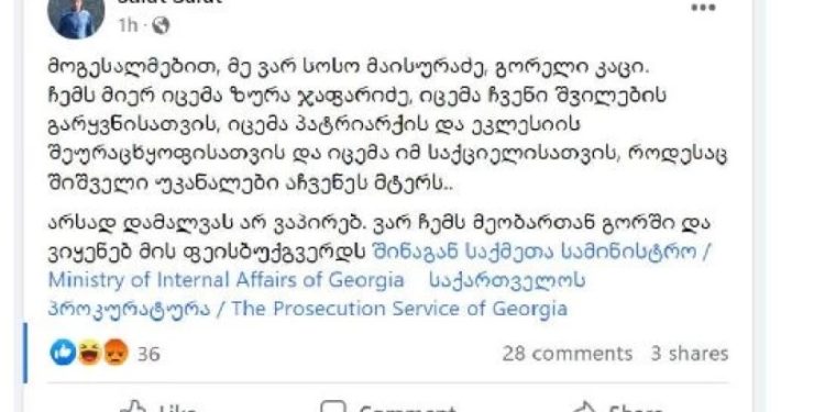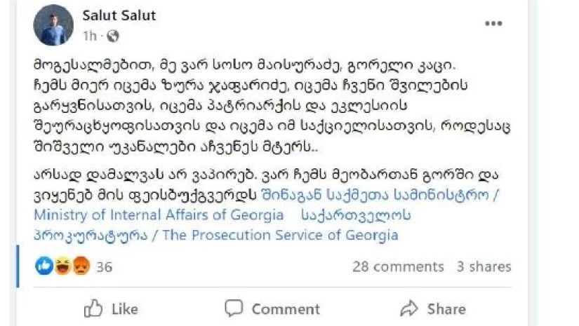 მე ვარ სოსო მაისურაძე, გორელი კაცი. ჩემ მიერ იცემა ზურა ჯაფარიძე, იცემა ჩვენი შვილების გარყვნისათვის, იცემა პატრიარქის და ეკლესიის შეურაცხყოფისათვის – ამის შესახებ სოსო მაისურაძე სოციალურ ქსელში, მისი მეგობრის ფეისბუქ გვერდზე წერს.