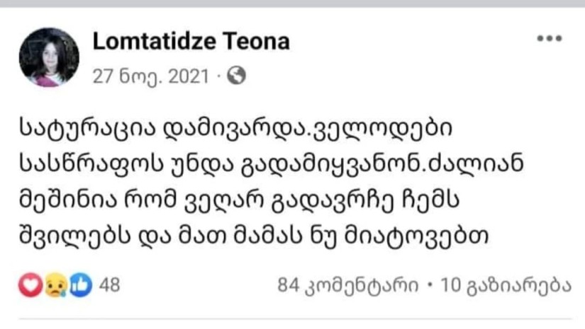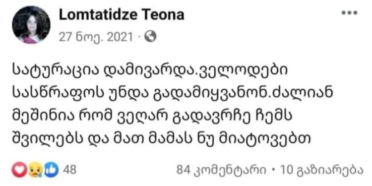 „მოკვდა ეს გოგო, აღარ არის. დაამარცხა ვირუსმა. რაც შეეძლო, იბრძოლა. შვილებზე წუხდა, განსაკუთრებით, გიორგიზე, რომელიც უნარშეზღუდულია. ახლა დგას ხატებთან და ევედრება, დედიკო გამიცოცხლეთო. ამ გოგოს სიკვდილმა მეც გამანადგურა. ფეისბუქიდან ვიცნობდი, ვიცოდი მისი ოჯახის სიდუხჭირის შესახებ. გულს მიკლავდა ფოტოებზე ასახული სასტიკი სიღარიბე. პატარა ბარბარეს პაწია თითებით აწყობილი სამკაულები, რომლითაც წამლის ფული უნდა ეშოვათ. ყველაფერი იგივეა, ცივი ოთახი, ნესტიანი, ჩაობებული კედლები. ბეტონის იატაკი, სამადლოდ ნაჩუქარი შეშის ღუმელი, რომელიც ოთახს კი არ ათბობს, სიცივეს ტეხს. ყველაფერი იგივეა, მაგრამ დედა აღარ უმზადებს ბავშვებს ღარიბულ საჭმელს. ახლა მამამ უნდა იკისროს დედობაც, თვითონაც ჯანმრთელობაგატეხილმა. მაგრამ რითი და როგორ?!