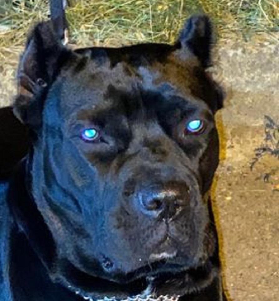 ეს შავი კანე კორსო-ძუ, 3 წლის, არ არის აგრესიული, ყველასთან მიდის. ყელზე უკეთია ყავისფერი ტყავის ვიწრო ყელსაბამი.