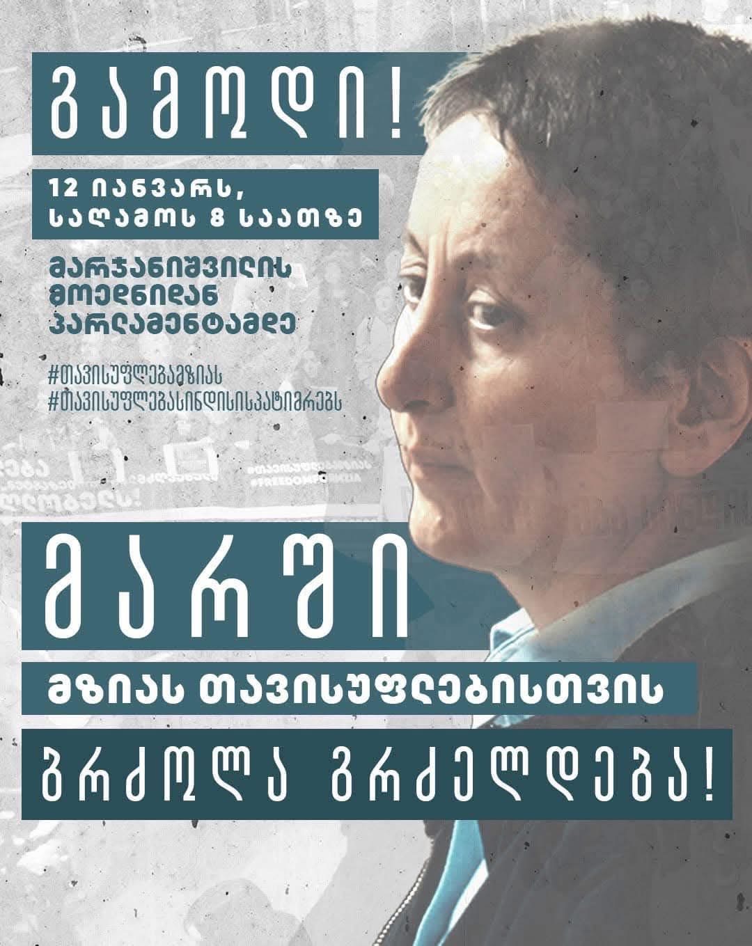 2026 წლის 12 იანვარს გასამართი შეკრება/მანიფესტაციის მონაწილეებმა შეკრება/მანიფესტაცია უნდა გამართონ იმგვარად, რომ საფრთხე არ შეექმნას საზოგადოებრივ უსაფრთხოებასა და მართლწესრიგს, ორგანოების, საწარმოების, დაწესებულებებისა და ორგანიზაციების ნორმალურ მუშაობას, ტრანსპორტის ან ხალხის შეუფერხებელ გადაადგილებას, ადამიანის სხვა უფლებებსა და თავისუფლებებს. ამასთან, მანიფესტაციის მსვლელობა განხორციელდეს ქ. თბილისი, კ. მარჯანიშვილის ქუჩაზე მდებარე მეტროსადგურ „მარჯანიშვილიდან“ (შეკრება ჩატარდეს მხოლოდ ხალხის სავალ ნაწილზე (ტროტუარზე) და მანიფესტაციის მონაწილეებმა ისარგებლონ არსებული მიწისქვეშა გადასასვლელით) საქართველოს პარლამენტის შენობამდე მხოლოდ კ. მარჯანიშვილის ქუჩის, გალაქტიონის ხიდის, მ. ჯავახიშვილის ქუჩის (ხიდის ქვეშ) და რუსთაველის გამზირის გავლით (მანიფესტაციის მონაწილეებმა ისარგებლონ მსვლელობისას არსებული ყველა მიწისქვეშა გადასასვლელით) და ზემოაღნიშნული მანიფესტაცია (მსვლელობა) ჩატარდეს მხოლოდ ხალხის სავალ ნაწილზე (ტროტუარზე). შეკრება/მანიფესტაციის მონაწილეებმა შესაბამისი ბანერები გამოიყენონ იმგვარად, რომ არ შეფერხდეს მოქალაქეთა გადაადგილება. სვლაგეზის დასრულების ადგილია საქართველოს პარლამენტის შენობის მიმდებარე ტერიტორია.