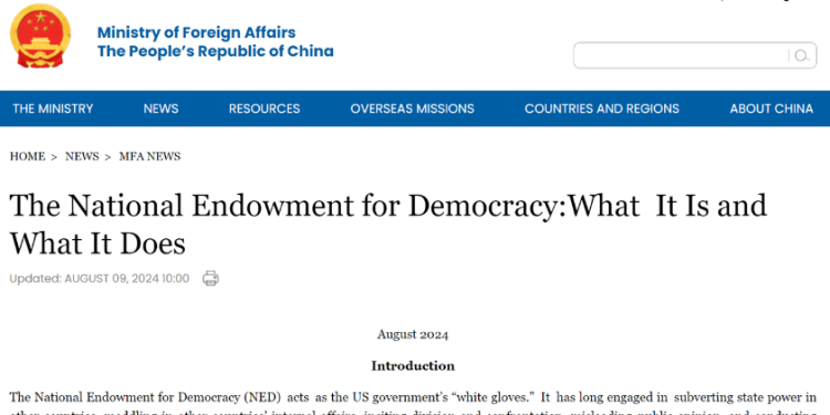 „NED-მა საქართველოში 21-ე საუკუნის დასაწყისში დააფინანსა სამი ადგილობრივი არასამთავრობო ორგანიზაციის დაფუძნება, რათა მოეწყო დემონსტრაციები ქვეყნის დედაქალაქ თბილისში. 2024 წლის მაისში NED-მა გამოუცხადა მხარდაჭერა და წაახალისა საპროტესტო აქციები საქართველოში უცხოური აგენტების კანონპროექტის წინააღმდეგ. 2024 წლის მაისში NED-მა გამოუცხადა მხარდაჭერა და წაახალისა საპროტესტო აქციები საქართველოში უცხოური აგენტების კანონპროექტის წინააღმდეგ“, – აცხადებს ჩინეთის საგარეო საქმეთა სამინისტრო.