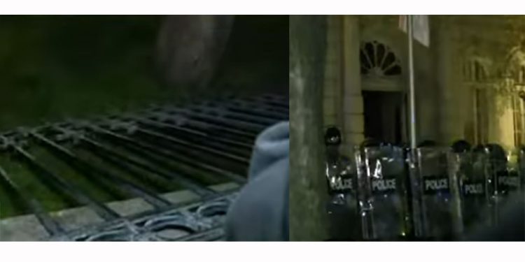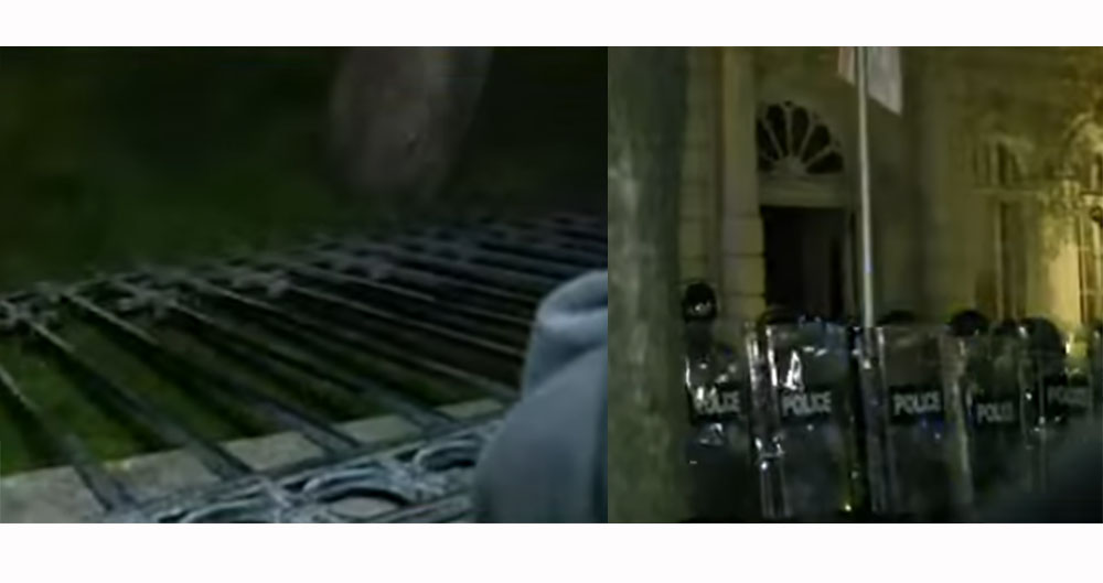 პრეზიდენტის სასახლის ადმინისტრაციის ეზო მონგრეულია, რამდენიმე ათეული სპეცრაზმელი და პოლიციელი, ადმინისტრაციის შენობის კართან დგანან, ეზოში არიან მოქალაქეები და მიმართავენ სპეცრაზმელებს.