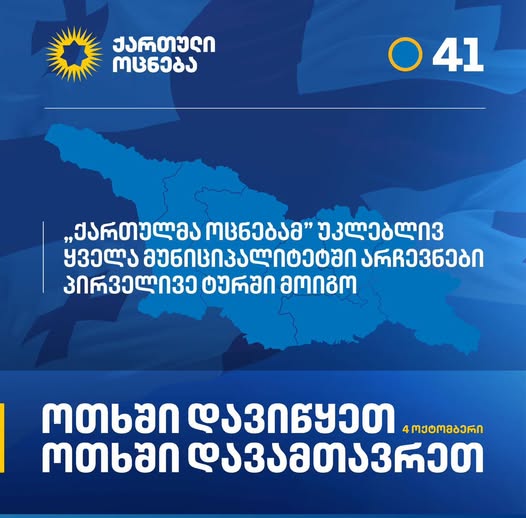 „ქართულმა ოცნებამ“ უკლებლივ ყველა მუნიციპალიტეტში არჩევნები პირველივე ტურში მოიგო. ოთხში დავიწყეთ და ოთხში დავამთავრეთ“ – ამ ქარდს „ქართული ოცნების“ ოფიციალური ფეისბუქგვერდი ავრცელებს.