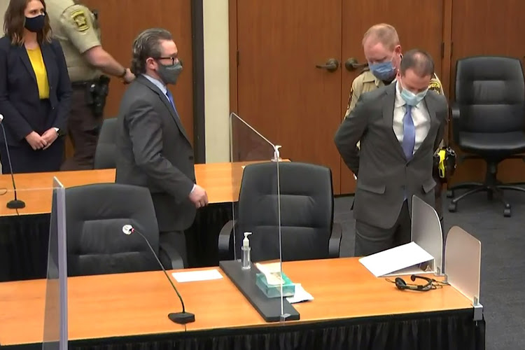 Former Minneapolis police officer Derek Chauvin is handcuffed to be led away after a jury found him guilty of all charges in his trial for second-degree murder, third-degree murder and second-degree manslaughter in the death of George Floyd in Minneapolis, Minnesota, U.S. April 20, 2021 in a still image from video.  Pool via REUTERS