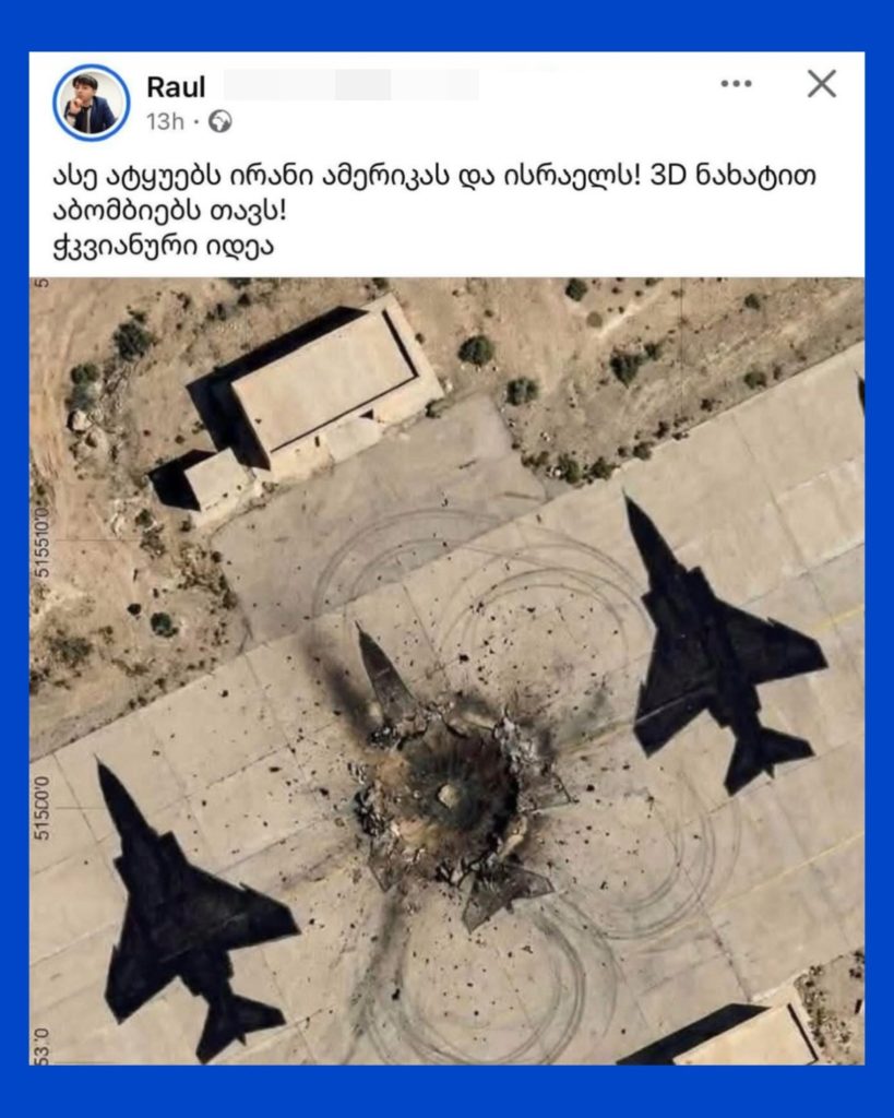 ქოცი ტროლები ავრცელებენ ასეთ უნიჭო ფეიკ ნიუსებს, რომ, თურმე, ამერიკა-ისრაელის დაზვერვას ირანი თვითმფრინავის სტენსილებს უხატავს მიწაზე და ეგრე “აბომბიებს” მოტყუებითო!!!