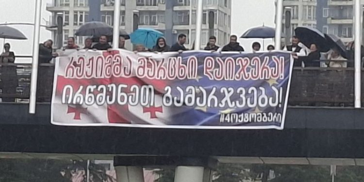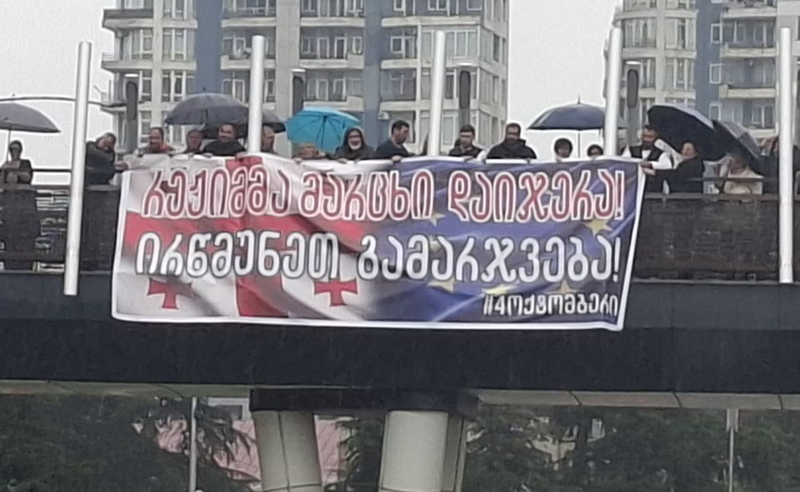 <strong>"რეჟიმმა მარცხი დაიჯერა, ირწმუნე გამარჯვება და მოდი 4 ოქტომბერს, 16:00 საათზე რუსთაველზე"</strong> - ბათუმში, ჭავჭავაძის გამზირზე მოქალაქეებმა ბანერი გადმოფინეს.