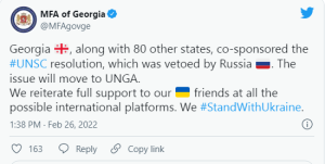 „საქართველომ, 80 სხვა სახელმწიფოსთან ერთად, თანასპონსორობა გაუწია გაეროს უსაფრთხოების საბჭოს რეზოლუციას, რომელსაც რუსეთმა ვეტო დაადო. აღნიშნული საკითხი გაეროს გენერალურ ასამბლეაში გადაინაცვლებს.
