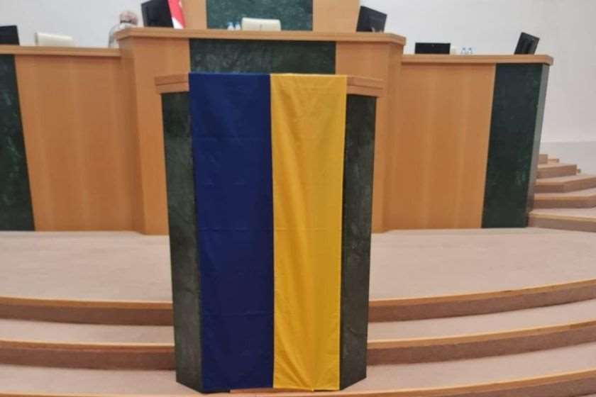 „ქართული ოცნების“ საპარლამენტო უმრავლესობამ პარლამენტის სხდომათა დარბაზში, მომხსენებლის ტრიბუნაზე უკრაინის დროშა გადმოფინა.