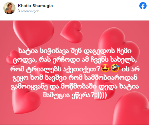 ის არ გეყო ხომ ბავშვი რომ სამშობიაროდან გამოიყვანე და მოწმობაში დედა ხატია შამუგია ეწერა?“- წერს შამუგია.