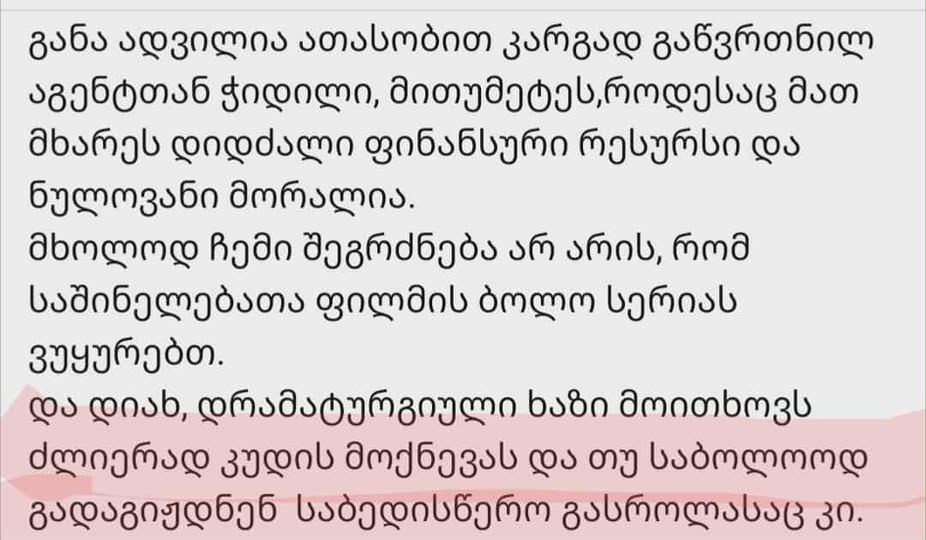 სულ გადღაბნილებმა რომ არ ვიაროთ და ფოკუსი გავასწოროთ. ეს არის ვრცელი სტატუსის ნაწილის სქრინშოთი, დაახლოებით ერთი თვის წინანდელი. ერთი ადამიანის მიერ დაწერილი, რომელთანაც ოდესღაც გულთბილი ურთიერთობა მქონდა. იმდენად შემზარა მაშინ ამის წაკითხვამ, არც გავაზიარე, უბრალოდ დავასქრინშოთე უზარმაზარ სტატუსში ჩაკარგული ეს წინადადება. არ დავაკონკრეტებ სპეციალურად გვარს, იმიტომ რომ გვარი არ არის აქ მთავარი. ეს არის კრებსითი ქოცის მხარდამჭერი და მოუწოდებს ქოცებს არ დაგვინდოს მე და ჩემნაირები. თუ “საჭიროა“ გვესროლონ კიდეც. ჩემი სიკვდილით რომ მოვკვდე ალბათ დაწერს, რომ უი, არ ვიყავი ცუდი გოგო, და ეწყინა. ამით საკუთარი “ზეადამიანურობის“ დემონსტრირებას მოაწყობს. მაგრამ თუ ქოცი მომკლავს, გააპრავებს, რომ ცუდ გზაზე შევდექი და აგენტს სახელმწიფო სხვანაირად ვერ მოექცეოდა. აი, ეს არიან ქოცები დღეს. ყველა ქოცი, რომელიც დღემდე შემორჩა მათ რიგებში და მხარდამჭერებში ჩვენს დახვრეტაზე ხელის მომწერია, ოღონდ პირადი კეთილდღეობა გადაირჩინოს. დანარჩენი თქვენ გადაწყვიტეთ, ვინც გინდათ იგლოვეთ და ვინც გინდათ არ იგლოვოთ.