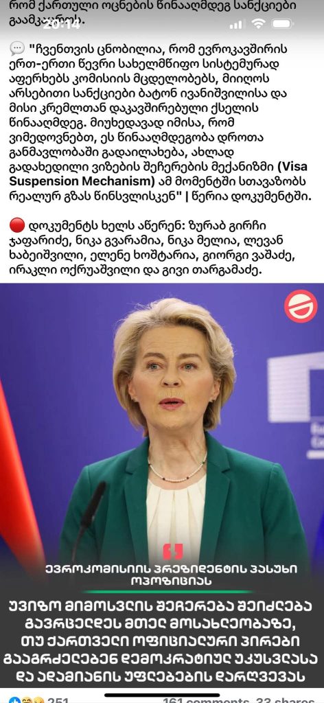 დავსქრინე და დავდე იმ ახვრების, საქართველოს მტრების სია, რომელთა წერილის საფუძველზეც ( წერილიდან ამონარიდიცაა) იმუქრება მძორი, კორუმპირებილი, კრეტინი ფონ დერ ლაიენი, რომ გაუუქმებს ქართველ ხალხს უვიზო რეჟიმს.