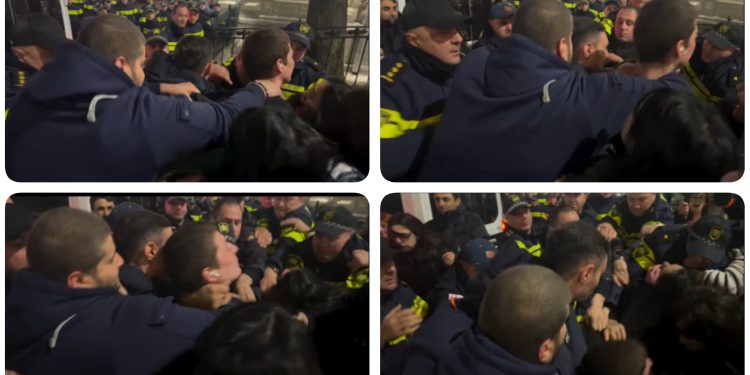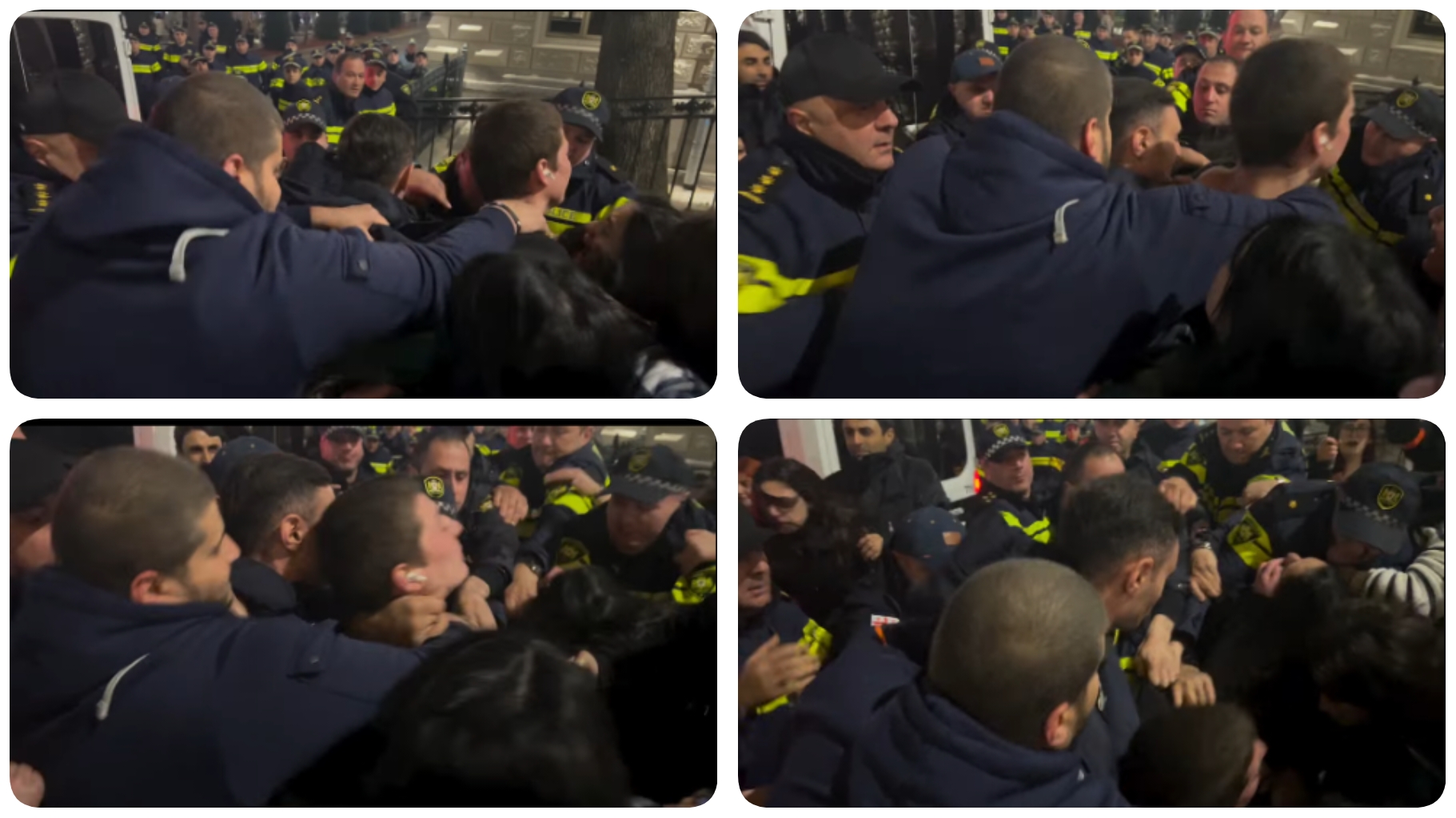 ფოტოგრაფი გიორგი მოსიაშვილი აქვეყნებს კადრებს, სადაც ჩანს რომ მშვიდობიანი აქციის მოქალაქეს, ათობით პოლიციელი თავს ისე ესხმის, ისე უჭერს კისერში ხელებს, რომ ახალგაზრდა კაცი პოლიციელთა ხელებშივე ჩაიკეცა ქუჩაში.