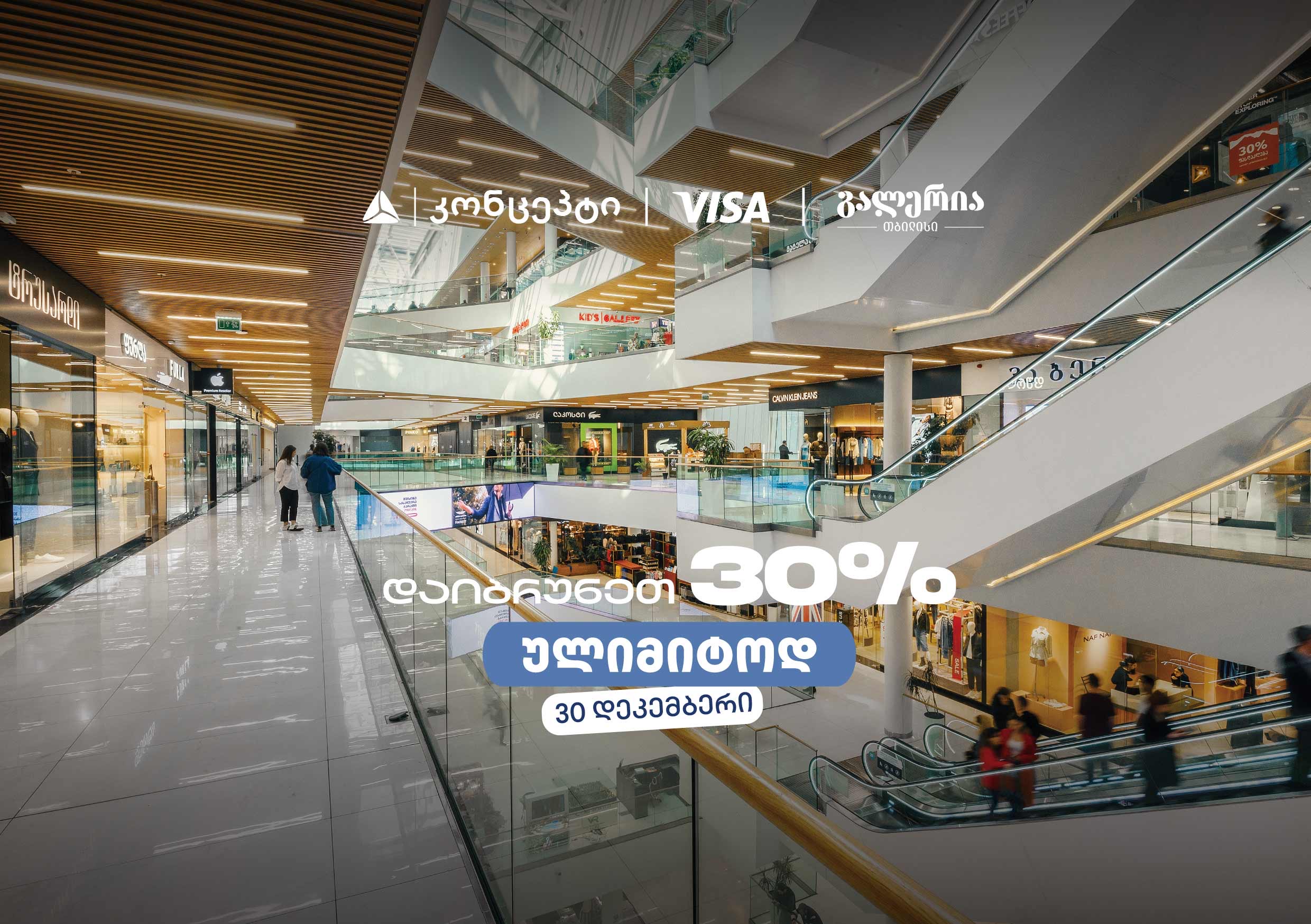 თიბისი კონცეპტის მომხმარებლებისთვის საახალწლო შეთავაზებები კვლავ არ დასრულებულა. მხოლოდ 30 დეკემბერს, გალერია თბილისის შერჩეულ ობიექტებში, თიბისი კონცეპტ Visa სადებეტო ბარათით გადახდისას, თანხის 30%-ს ულიმიტოდ და მომენტალურად დაიბრუნებთ.