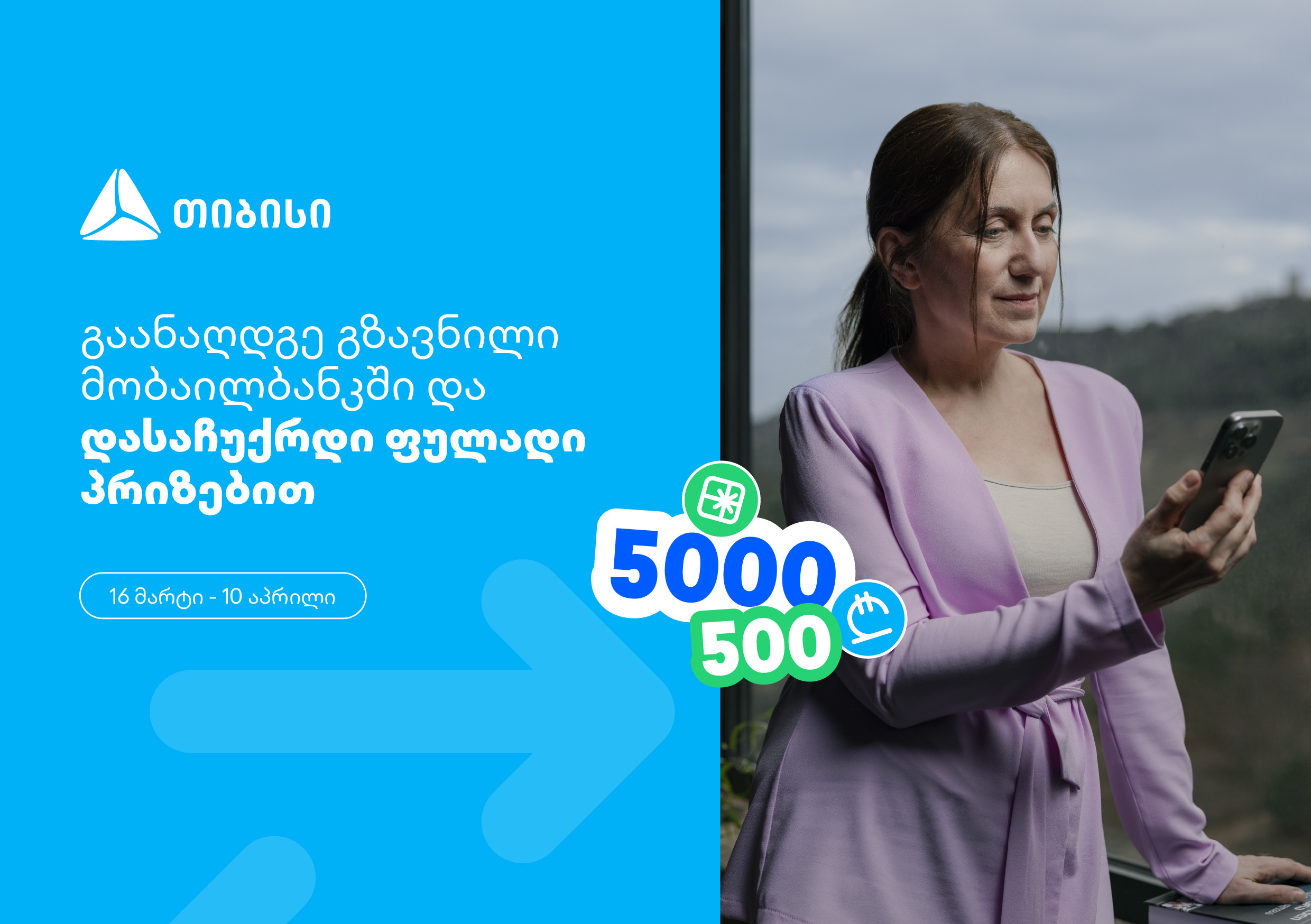 16 მარტიდან 10 აპრილის ჩათვლით, გაანაღდე ფულადი გზავნილი მობაილბანკში და მიიღე შესაძლებლობა, ერთგულ ყულაბაში დასაჩუქრდე 500 ლარით ან სუპერპრიზით– 5 000 ლარით.