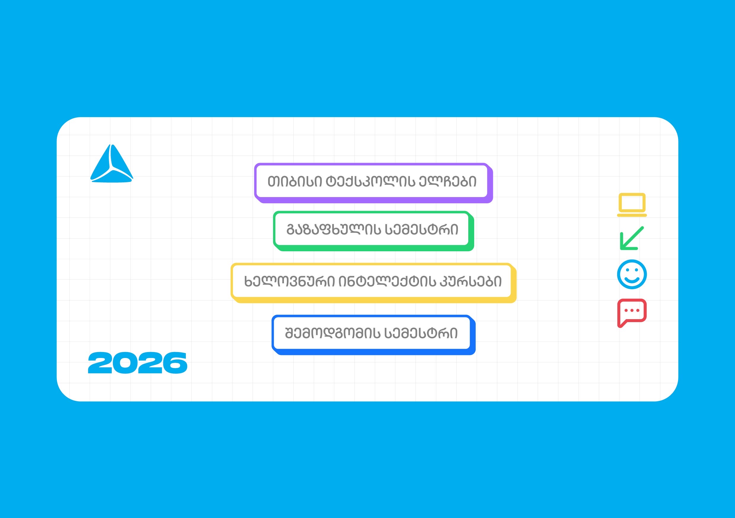 2026 წლის კიდევ ერთი სიახლე ხელოვნური ინტელექტის კურსია, რომელიც უფროსკლასელებს აძლევს შესაძლებლობას, დაეუფლონ მომავლის ერთ-ერთ ყველაზე მოთხოვნად უნარს და AI, იდეის შექმნიდან, მის ტექნიკურ განხორციელებამდე გამოიყენონ. კურსი პრაქტიკულ სწავლებაზეა დაფუძნებული და ვებ მენეჯმენტის, გრაფიკული დიზაინისა თუ AI პროგრამირების მიმართულებით მიღებული ცოდნის საფუძველზე, მოსწავლე კურსსრეალური ციფრული პროდუქტის შექმნით დაასრულებს.