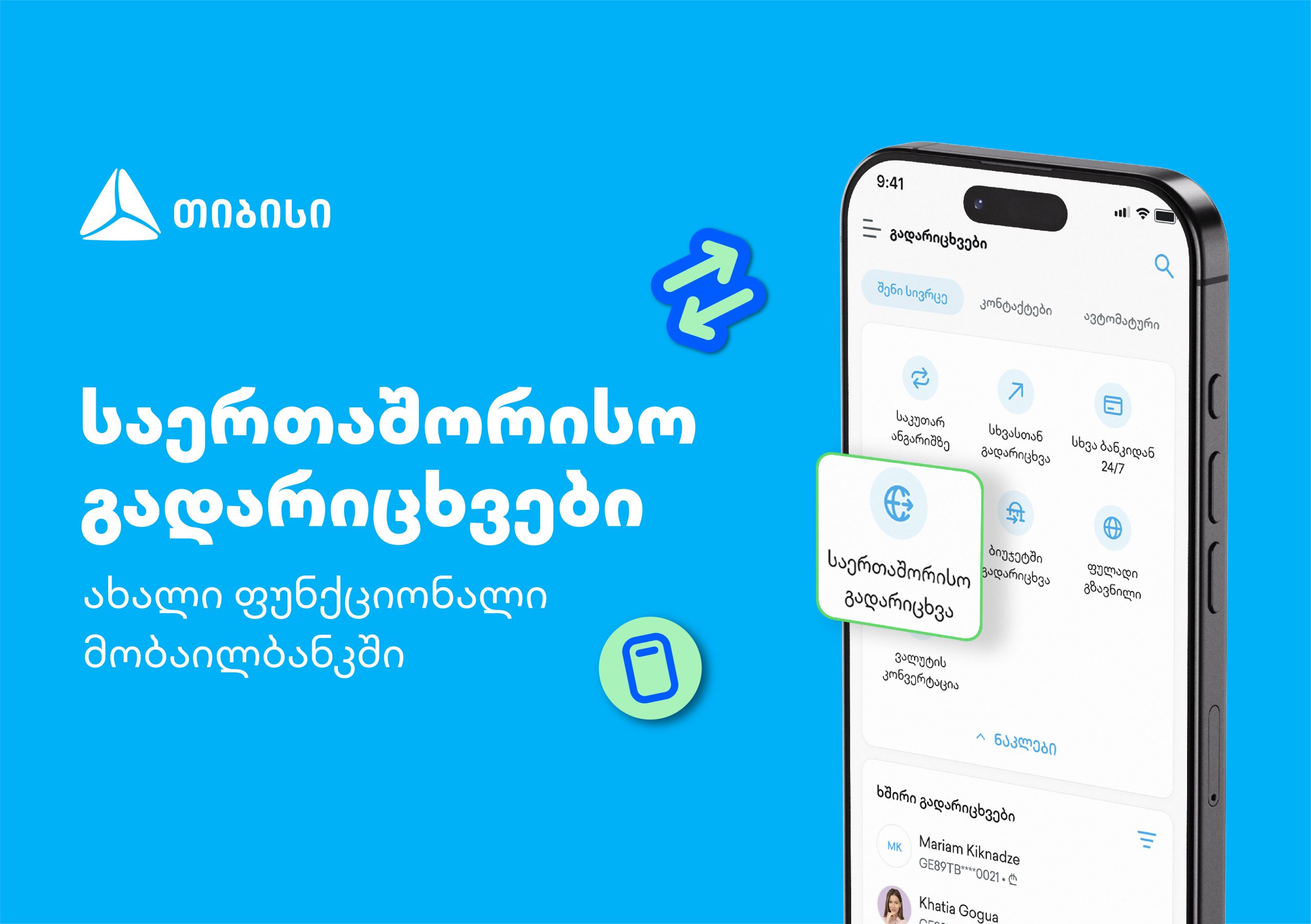 თიბისიმ, მომხმარებელთა ყოველდღიურობის გასამარტივებლად, კიდევ ერთი ახალი პროდუქტი დანერგა — მობაილბანკის მომხმარებელ ფიზიკურ პირებს საერთაშორისო გადარიცხვები უკვე ფილიალში ვიზიტის ან ვებ-ბანკში შესვლის გარეშე, პირდაპირ მობილური აპლიკაციიდან შეუძლიათ.