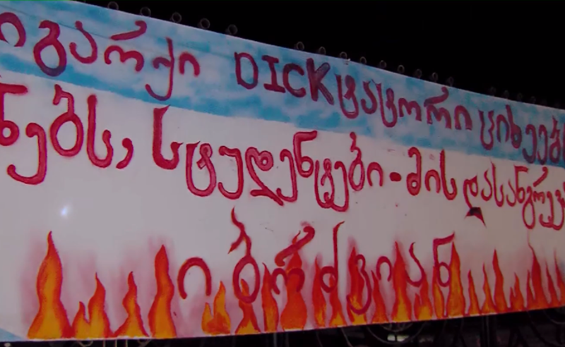 „თავისუფლება სინდისის პატიმრებს!“ – თბილისის სახელმწიფო უნივერსიტეტის პირველ კორპუსთან მოქალაქეები არიან შეკრებილები.