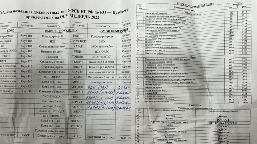 შეიძლება იყოს ტექსტი, რომელშიც ნაჩვენებია „таблица позывных должностнь'х лиц уфсв нг рф ко привлекаемых на ocy медведь 2022 давжность собр командир спп кузбассу база 102 позывной омонновокузнецк командир позывной 103 командир отряда начальник пвпсо нмч нструктор командир отряда командир знаменск KAPAT ΚΕΜΕΡΩΒΩ капкан 105 капкан 107 фельдшер 3HI начальник отделения начальник отделения инженер командир взвода взвода капкан капкан 260 капкан 261 264 заринск командир отделения моздок командир 2взвода взвода 266 командир взвода командира вз-да командир отделения командир отделения командир швед звзвода 276 капкан рязань ялта ногинск покров ростов сочи оружейный капкан 279 доложить инженер связи капкан 99 задержал) 013 запасно всех служба безпеки украйни“-(ი)ს გამოსახულება