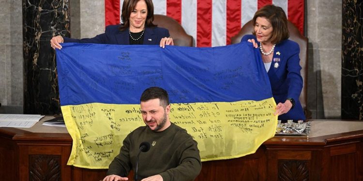 უკრაინის პრეზიდენტმა, ვოლოდიმირ ზელენსკიმ აშშ-ის კონგრესს ჯარისკაცების ხელმოწერებით უკრაინის დროშა გადასცა.
